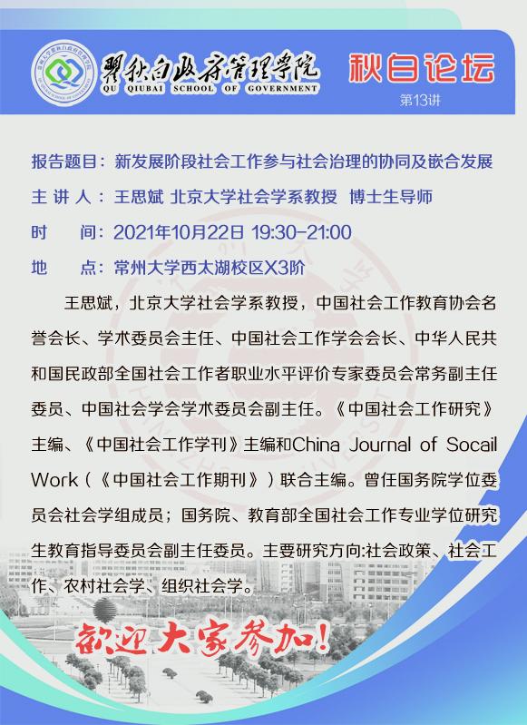 秋白论坛第13讲:新发展阶段社会工作参与社会治理的协同及嵌合发展