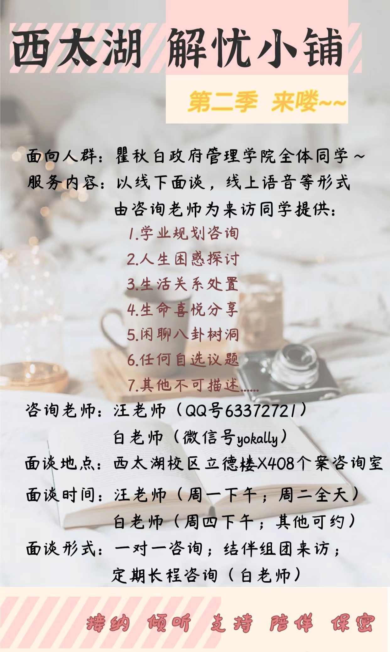 本学期,“解忧小铺”积极参与疫情防控工作,为封校期间的大学生提供情绪疏导和心理调适,帮助大家抚平压力和焦虑,提升积极面对生活、解决问题的信心,平稳顺利地渡过这段特殊时光。目前,“解忧小铺”项目已运行两个学期,服务形式和内容不断创新,未来将逐步打造彰显本院社会工作实践特色的高校学生工作和心理健康服务品牌。