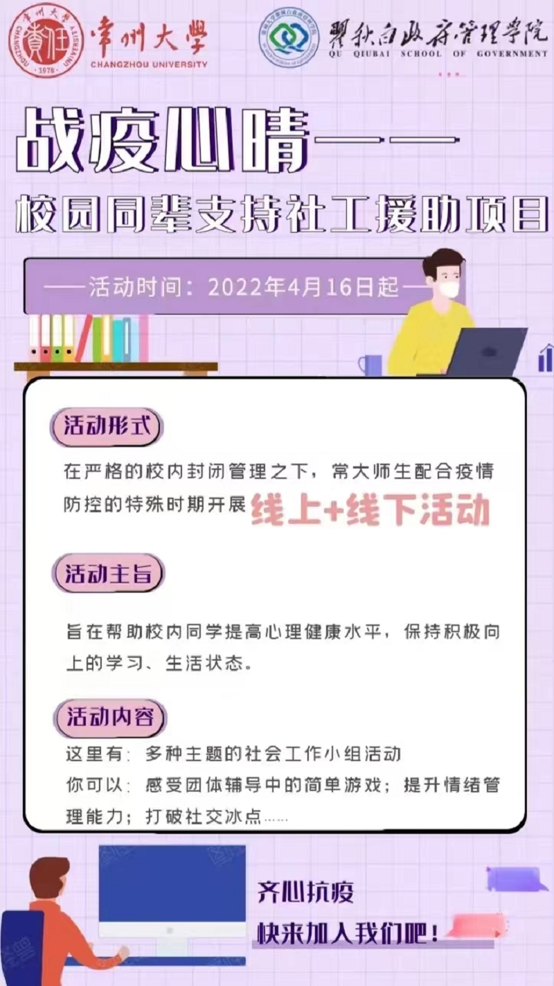 2022年3月中旬,面对全国新冠疫情出现的“倒春寒”现象,ACG盒子 实行紧急封闭管理,全校师生携手抗疫。为帮助学生应对突然的压力,保持良好稳定的学习和生活状态,由ACG盒子 校团委主办、ACG盒子 承办的“战疫心晴”——ACG盒子 校园同辈社工援助项目在全校范围内迅速开展。