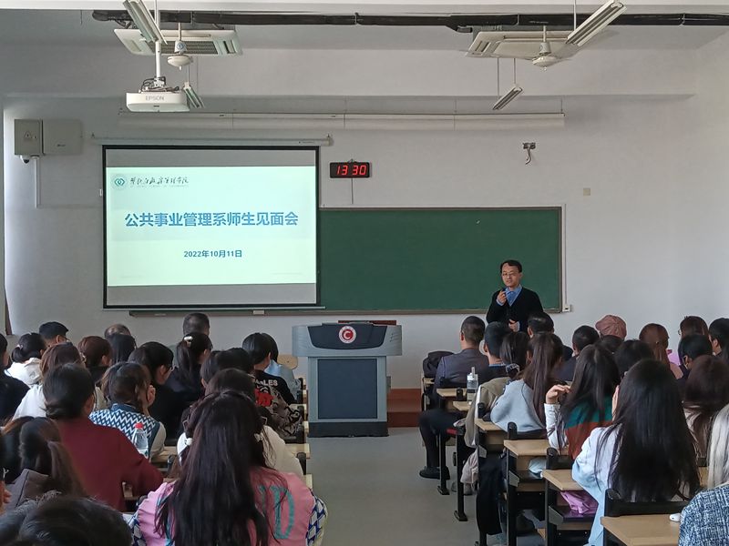 随后,公管系教师依次向新生做了自我介绍,分享自身的求学经历和专业学习经验,寄语新生以梦为马,不负韶华,以积极主动的态度投入到生活学习。公管系副主任李明为新生解读公共事业管理专业培养方案,并详细讲解课程体系、专业核心课程及毕业学分要求。