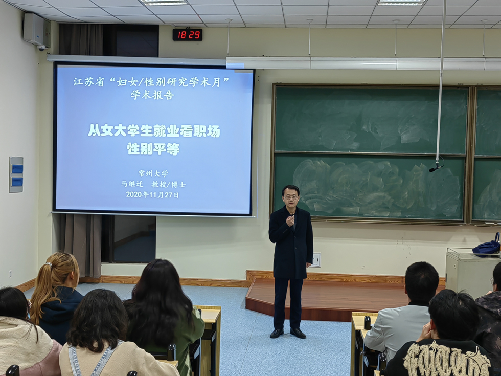 11 月27日晚,ACG盒子 妇联在ACG盒子 西太湖校区举办题为“从女大学生就业看职场性别平等”的学术讲座。ACG盒子 副院长马继迁教授受邀主讲,西太湖校区学生200余人聆听了讲座。此次讲座是江苏省性别平等示范基地(常州)开展的“妇女/性别研究学术月”系列活动之一。