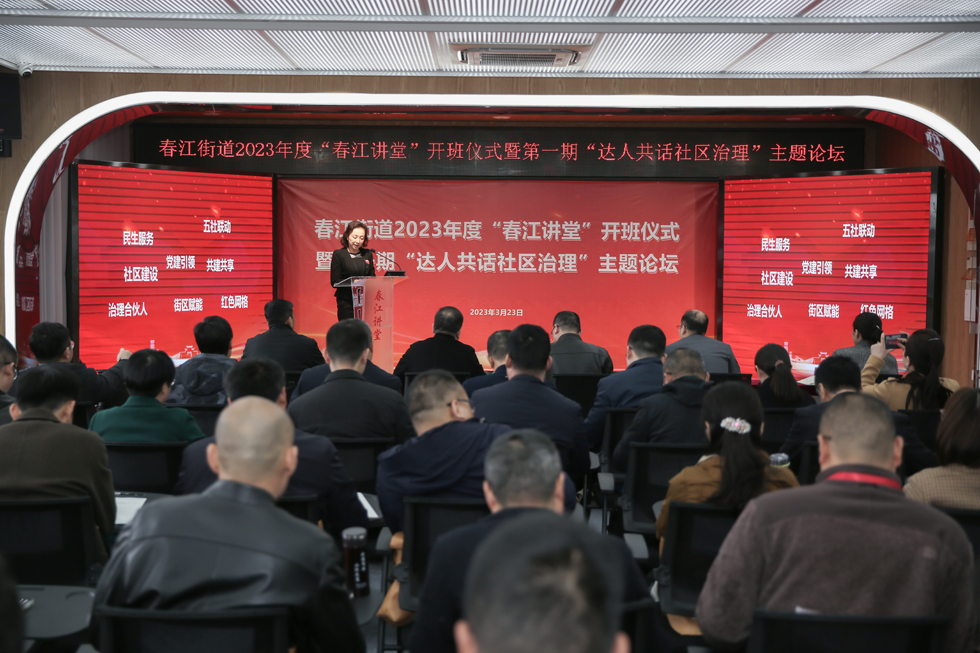 2023年3月23日下午,常州市新北区春江街道举办2023年度“春江讲堂”开班仪式暨第一期“达人共话社区治理”主题论坛。新北区人社局副局长、党组副书记、民政局局长杨震乾,春江街道党工委书记高月锋,党工委副书记、政协工委主任石耀星,街道办事处副主任王华,党工委委员、组织委员喻慧娟,区人社局民政处陈华兴参加本次论坛。