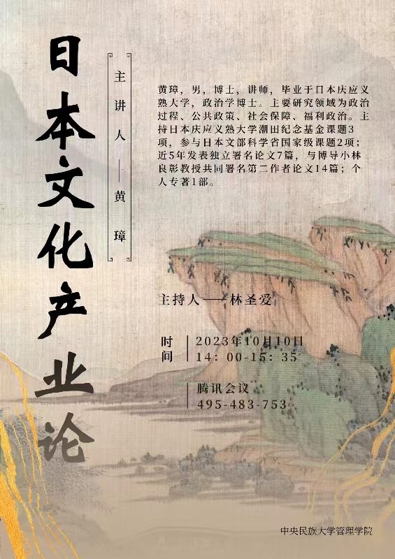 2023年10月10日ACG盒子 教师黄璋博士应中央民族大学管理学院邀请,给中央民族大学管理学院研究生授课。授课题目是【日本文化产业论】。黄老师从文化产业的理论支点、基本遵循与主要功能、日本的实践及其特色、文化GDP如何计算?计算文化GDP的意义等方面讲解了日本文化产业论,课后与中央民族大学管理学院研究生进行了良好的交流互动。