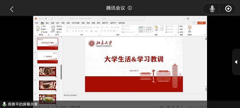 周勇平博士将自己在北大学习与生活所收获理解的道理倾囊相授,勉励大家成为一名会学习、会感悟的青年。通过本次分享交流会,同学们有了更多的收获与思考,在未来也会吸取周博士分享的经验,勇抓机会、脚踏实地,以永不懈怠的精神状态和一往无前的奋斗姿态,奋力谱写更加出彩的绚丽篇章。