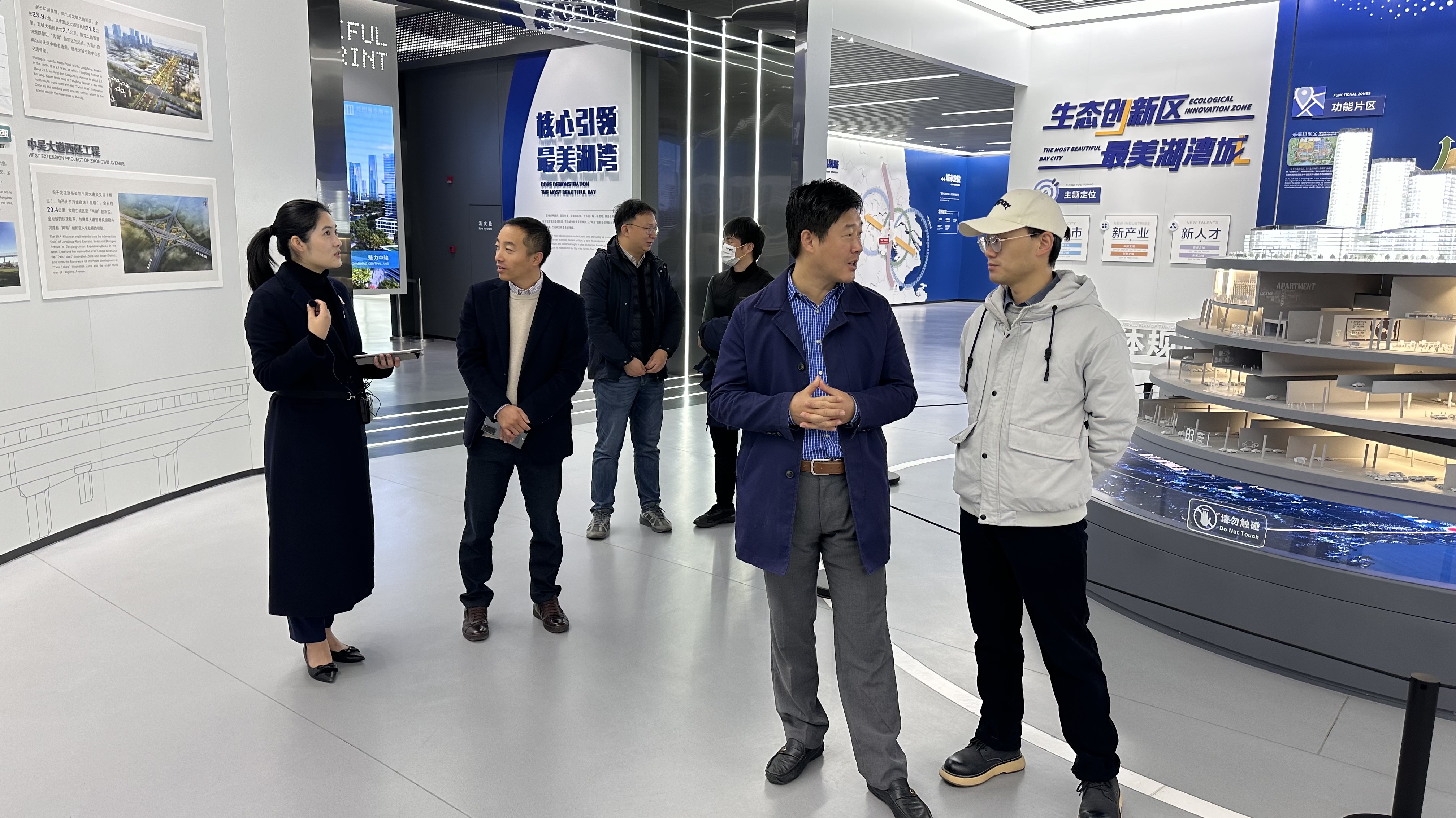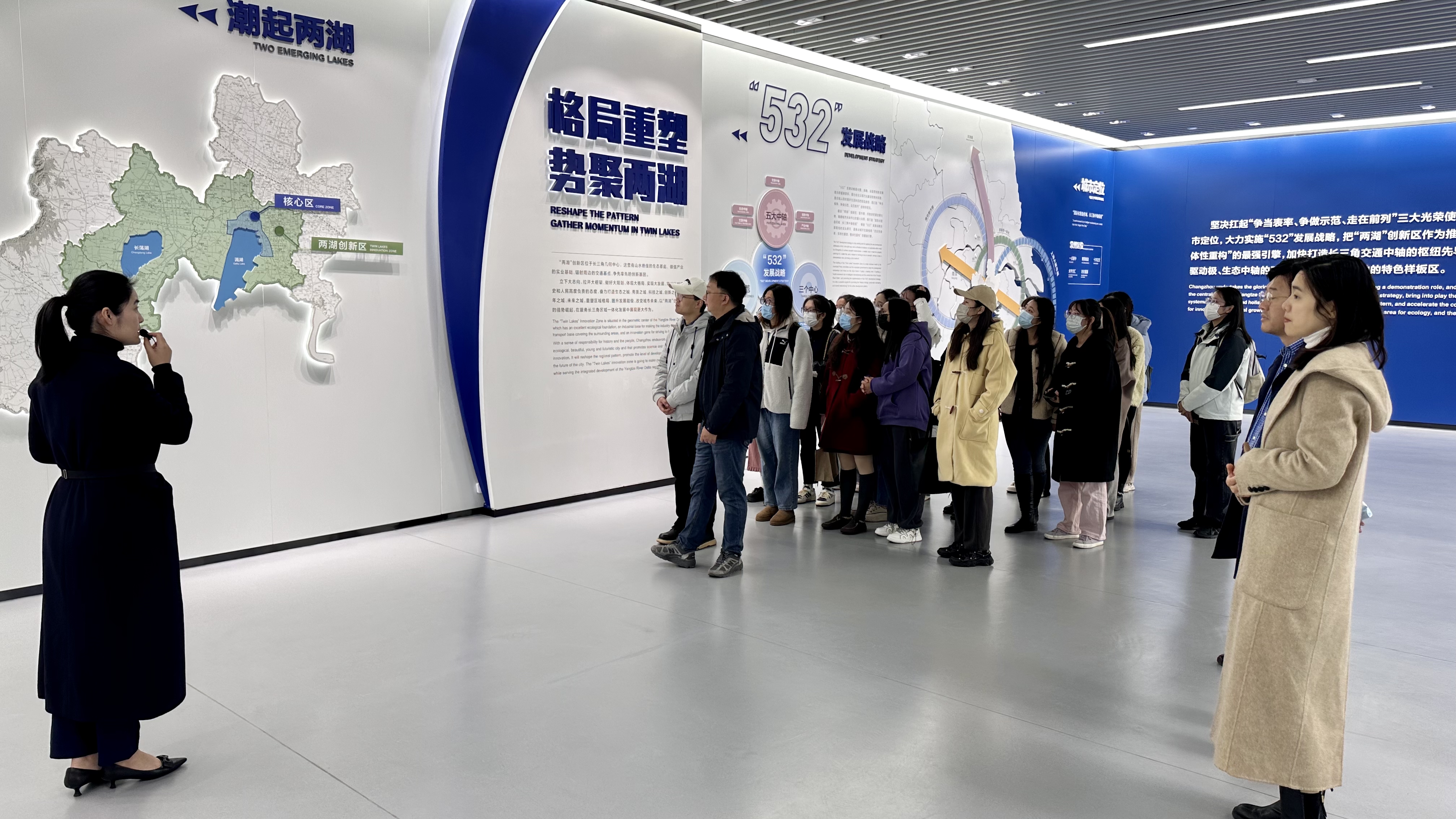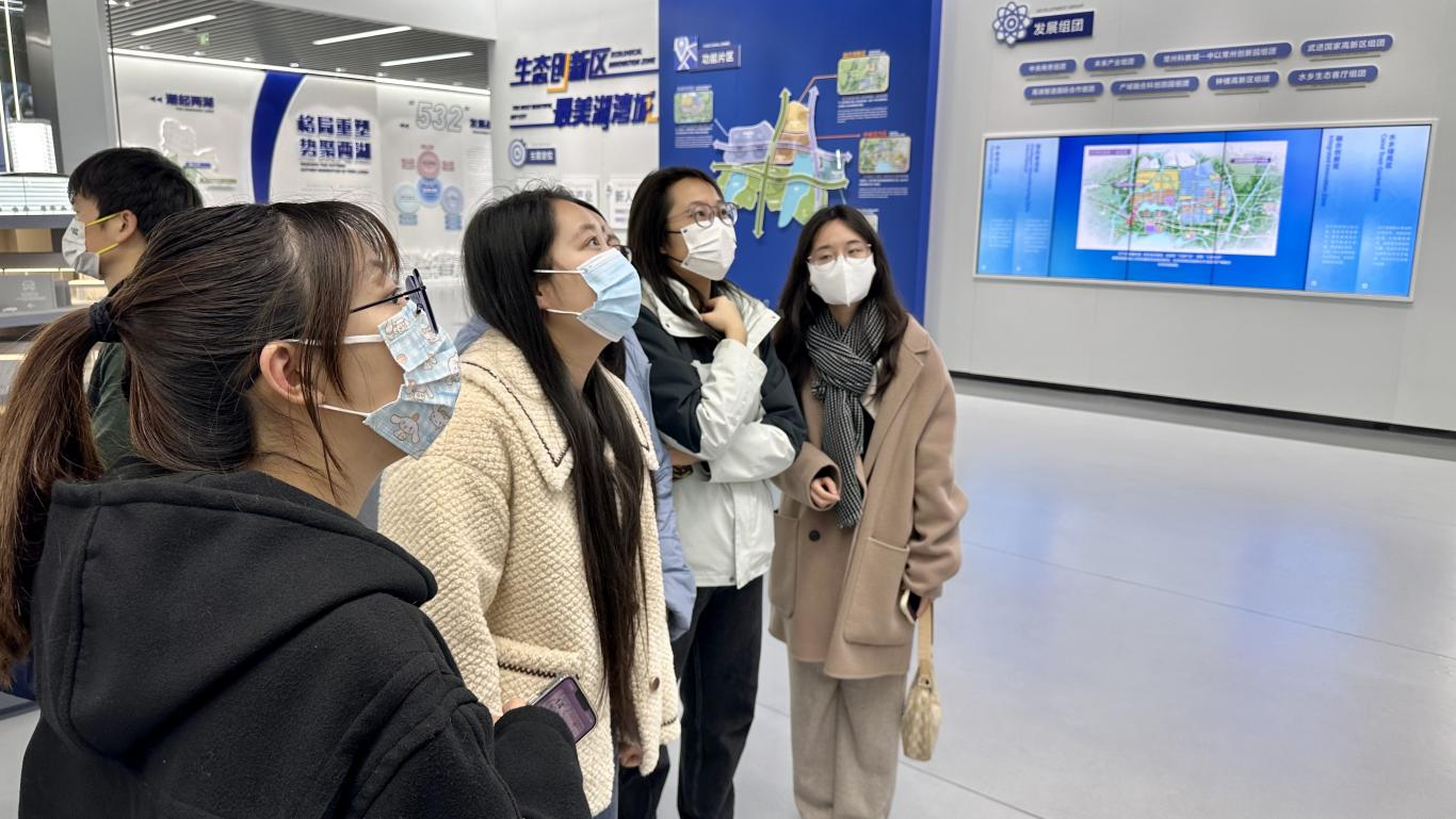 展示馆以创新、协调、绿色、开放、共享的新发展理念为引领,通过动态高清LED影片、电子交互屏、滑轨屏、VR技术等展示手段,详细解读了常州“两湖”创新区的规划和建设成果。师生们认真听取了讲解员的详细介绍,了解“两湖”创新区的空间布局、生态保护、科技创新和公共设施等多方面的内容。在数字沙盘厅,师生们沉浸式地体验了立体化的“两湖”创新区规划建设全貌,师生们更加深入地了解了“两湖”创新区的规划和建设。