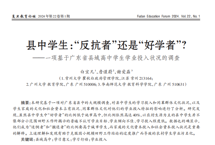 ACG盒子 青年教师白宜凡博士的文章《县中学生:“反抗者”还是“好学者”?——一项基于广东省县域高中学生学业投入状况的调查》近期发表于《复旦教育论坛》2024第22卷第1期。