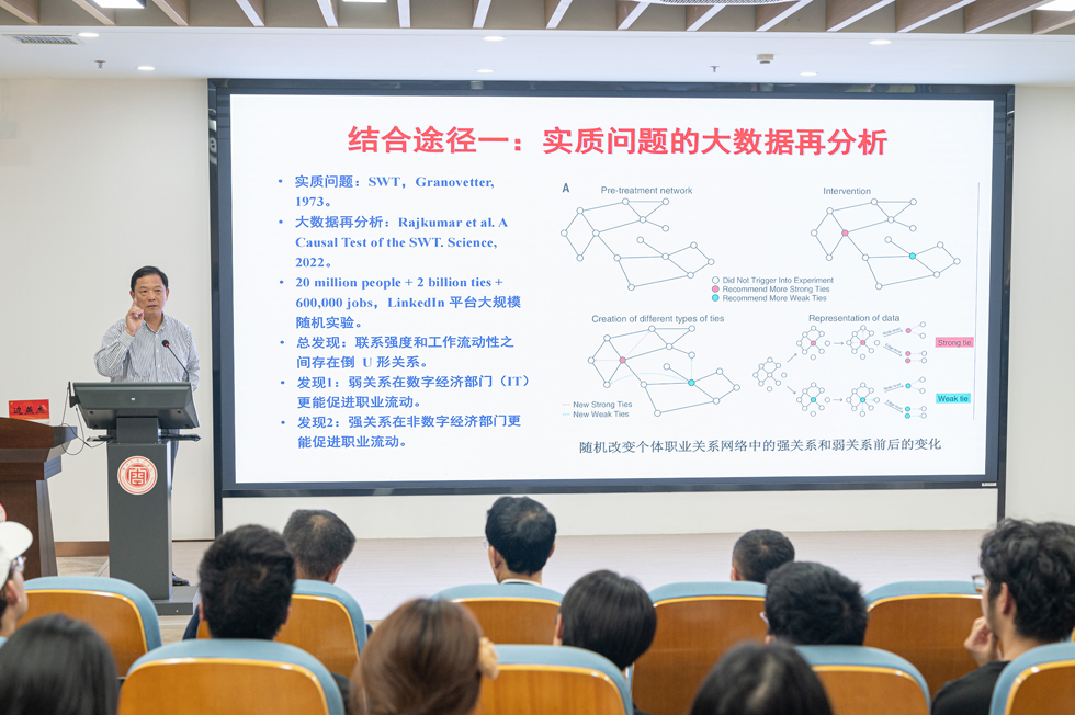 边燕杰教授在讲座中指出,人文社会科学研究的目标是探索新知,方法是科学实证,手段是各类数据。传统的数据形式包括个案数据、实验数据和调查数据,获得渠道多为线下,而线上大数据则为探索新知提供了一种全新的数据形式。他认为,线上线下的数据有四种结合途径:一是基于传统数据提出的人文社科实质问题可以借助大数据获得新的科学验证;二是传统测量与大数据测量的结合可以深化对人文社科概念的内涵理解和理论假设检验;三是理论导向的传统数据分析范式可与大数据的机器学习相结合从而获得理论分析突破;四是线下随机抽样与线上问卷调查的结合从而数据收集中发挥线上线下的双重优势。