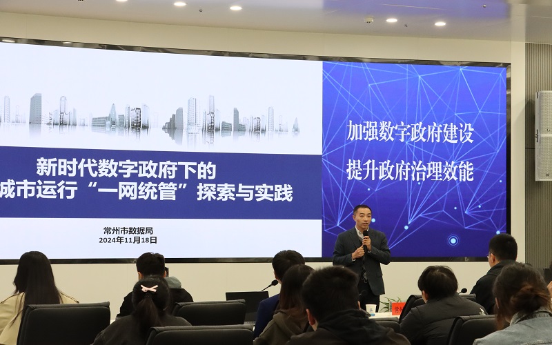杨处长向师生现场展示了常州市数字政府统一登录门户和“常智慧”APP的模块功能。截至目前,该平台已经同步了全市机关事业单位人员和基层网格人员共15.4万人的用户信息,为基层减负增效做出了重要贡献。