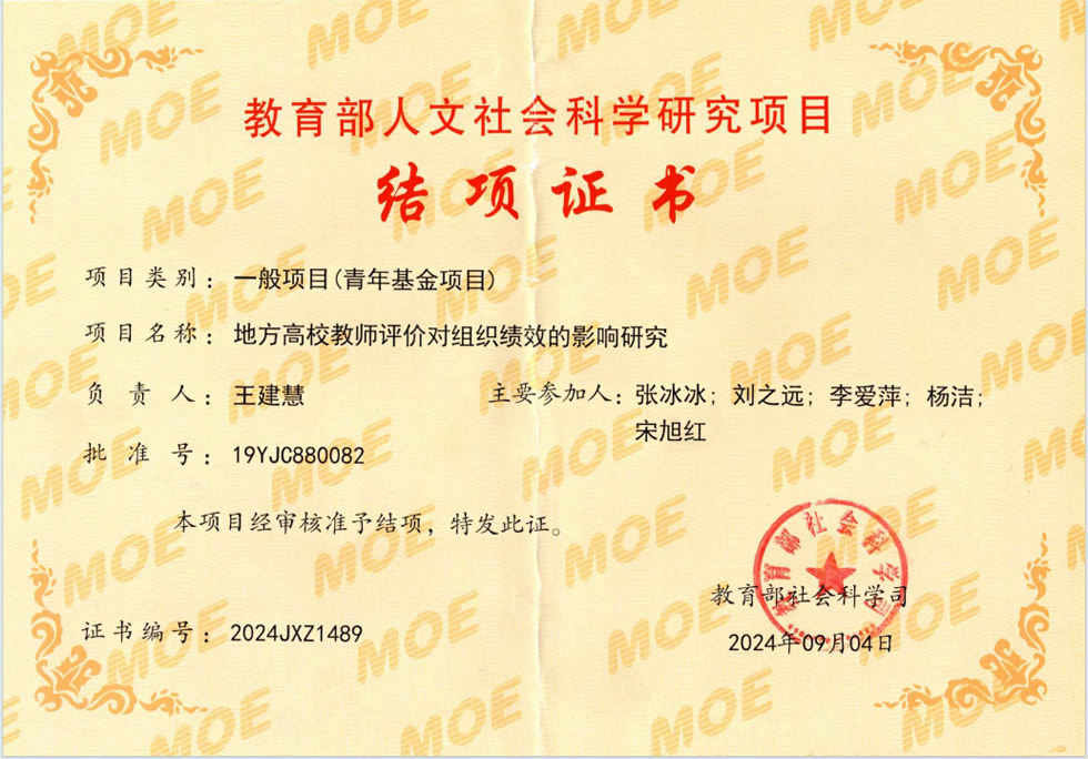 王建慧副教授的《地方高校教师评价对组织绩效的影响研究》项目,则聚焦于地方高校教师评价体系对组织绩效的影响。该项目通过问卷调查与案例分析,深入探讨了高校教师评价导向的组织效能影响及其机制,为高校优化教师评价体系提供了重要的理论支撑与实践参考。该项目研究出版了学术专著1部,发表CSSCI期刊论文3篇、省级论文2篇,并完成了2份研究报告,其中1份还获得学校领导的批示。