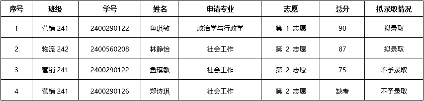 根据教务处“关于做好2024-2025-2学期本科学生转专业工作的通知”精神和要求,学院于2025年2月28日对申请转入学院相关专业的学生进行了考核,经专业面试、笔试,以及院转专业考核领导小组审核,现将考核总评成绩及拟录取名单公布如下: