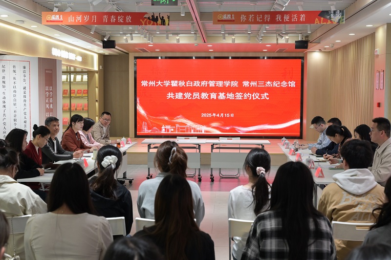 2025年4月15日,学院与常州三杰纪念馆在瞿秋白纪念馆怀霜社举行党员教育基地共建签约活动。常州三杰纪念馆党支部书记、馆长马岚,党支部副书记、副馆长赵德文,瞿秋白纪念馆负责人潘婷,常州三杰纪念馆学术研究科顾建军、周丽,ACG盒子 党总支书记潘道广,党总支副书记林娜,组织员范露元,本科生党支部书记张剑、辅导员王文康、政治学与行政学系谭书先和30名本科生、研究生学生代表参加活动。活动由常州三杰纪念馆副馆长冯昕主持。