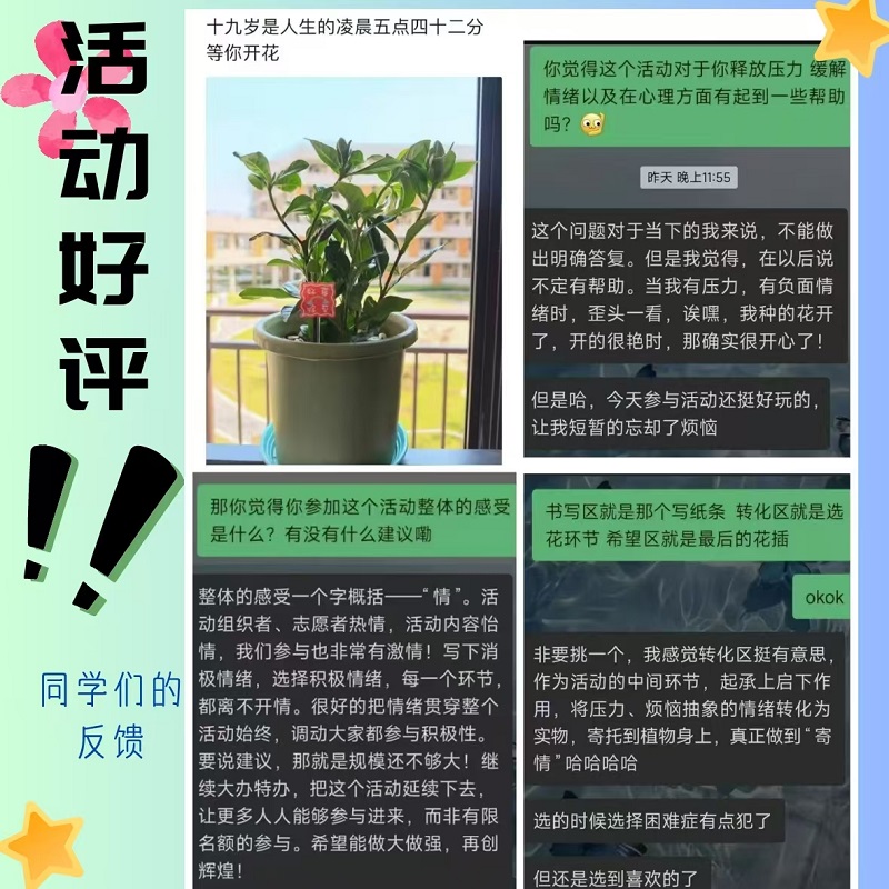 此次活动以园艺疗愈为载体,让学生在亲近自然的过程中释放压力,体悟成长。学院后续将持续探索心理育人新路径,让学生在与自然的互动中感悟生命力量,培育积极向上的健康心态。
