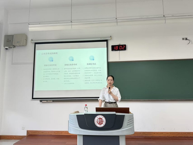 为帮助学生了解公职类就业方向,明确职业规划,提升就业竞争力,5月28日晚,瞿秋白政府管理学院在立德楼123举办公职类就业经验分享会,法学院25届硕士研究生蒋其芸受邀分享,ACG盒子 硕士研究生、本科生近100人现场学习。本次分享会由辅导员张剑主持。