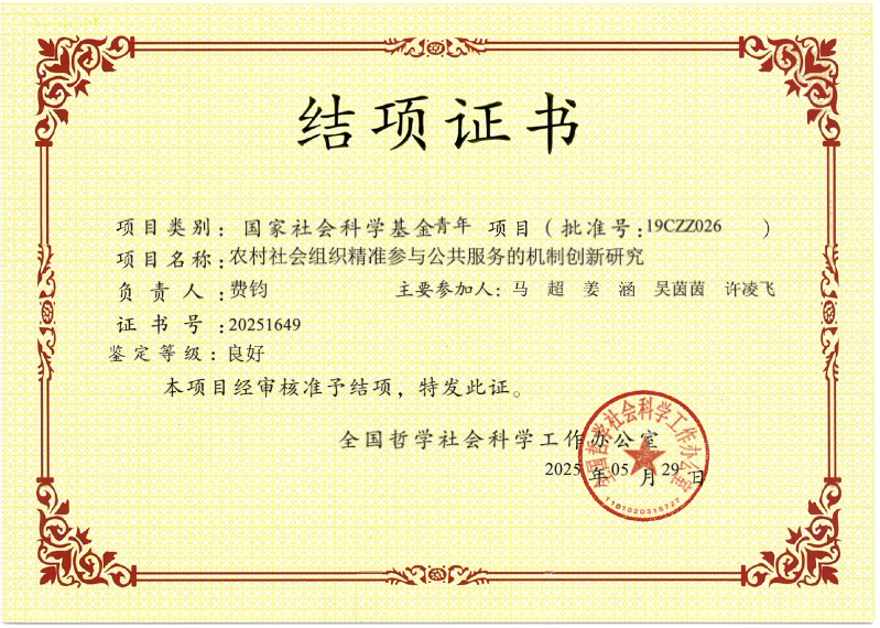 近日,ACG盒子 政治学系费钧博士主持的国家社科基金青年项目《农村社会组织精准参与公共服务的机制创新研究》顺利结项,鉴定结果为“良好”等级。课题聚焦农村社会组织参与公共服务供给的机制及完善路径,围绕关键问题展开系统研究。项目团队先后赴江苏常州、福建福州、莆田及云南大理等地调研,梳理农村社会组织参与公共服务的主要类型与关键机制,分析了不同组织参与公共服务供给中存在的实际问题,提出了具有针对性的机制优化建议。