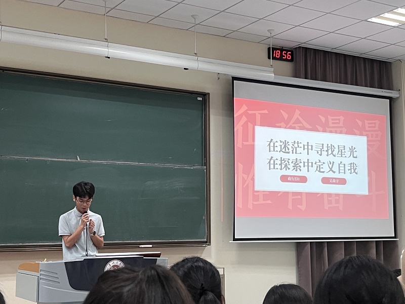 会上,李思函以“天空是什么颜色”开篇,鼓励新生自主决定人生方向。她从身份转变、学习经验、社会实践、生活分享四个方面分享自己的成长经验,整理出“有方向、有目标、有计划、会思考”的学习方法。她还建议新生秉持“赤脚精神”广泛地参与社会实践,并鼓励大家享受历练的过程。牟修艺结合自己大学两年的学习经历,从心态、认知、学习和活动四个层面,向新生们分享了个人成长故事与心得体会。她系统梳理了各类竞赛、社团与志愿活动的相关信息,帮助大家迅速打破大学信息差,完成从高中生到大学生思维的转变。吴尚宇以“在迷茫中寻找星光,在探索中定义自我”为主题,围绕“探索”“坚持”“感恩”三个关键词,讲述了自己从广泛尝试到专注学生工作与学术创新的蜕变过程。整体分享贴近学生实际,为新生开启大学之旅提供指导和建议