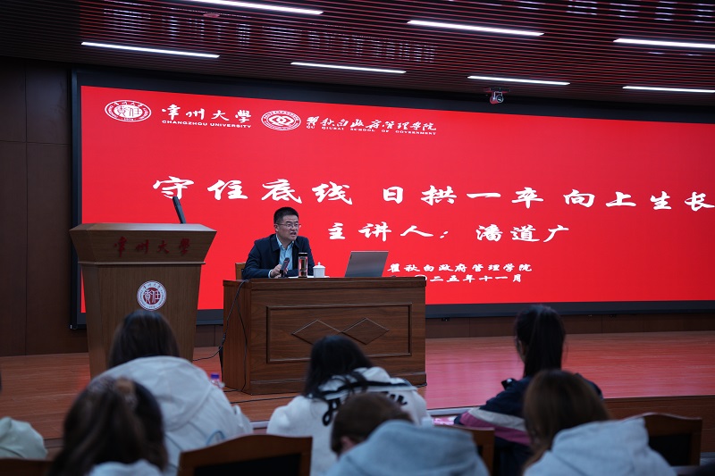 为帮助2025级新生确立正确价值导向,明确成长发展方向,11月4日,学院新生思政教育讲座在图书馆白云报告厅举行,由学院党委书记潘道广作了题为“守住底线 日拱一卒 向上生长”的报告。学院2025级全体新生参加活动,辅导员王文康主持讲座。